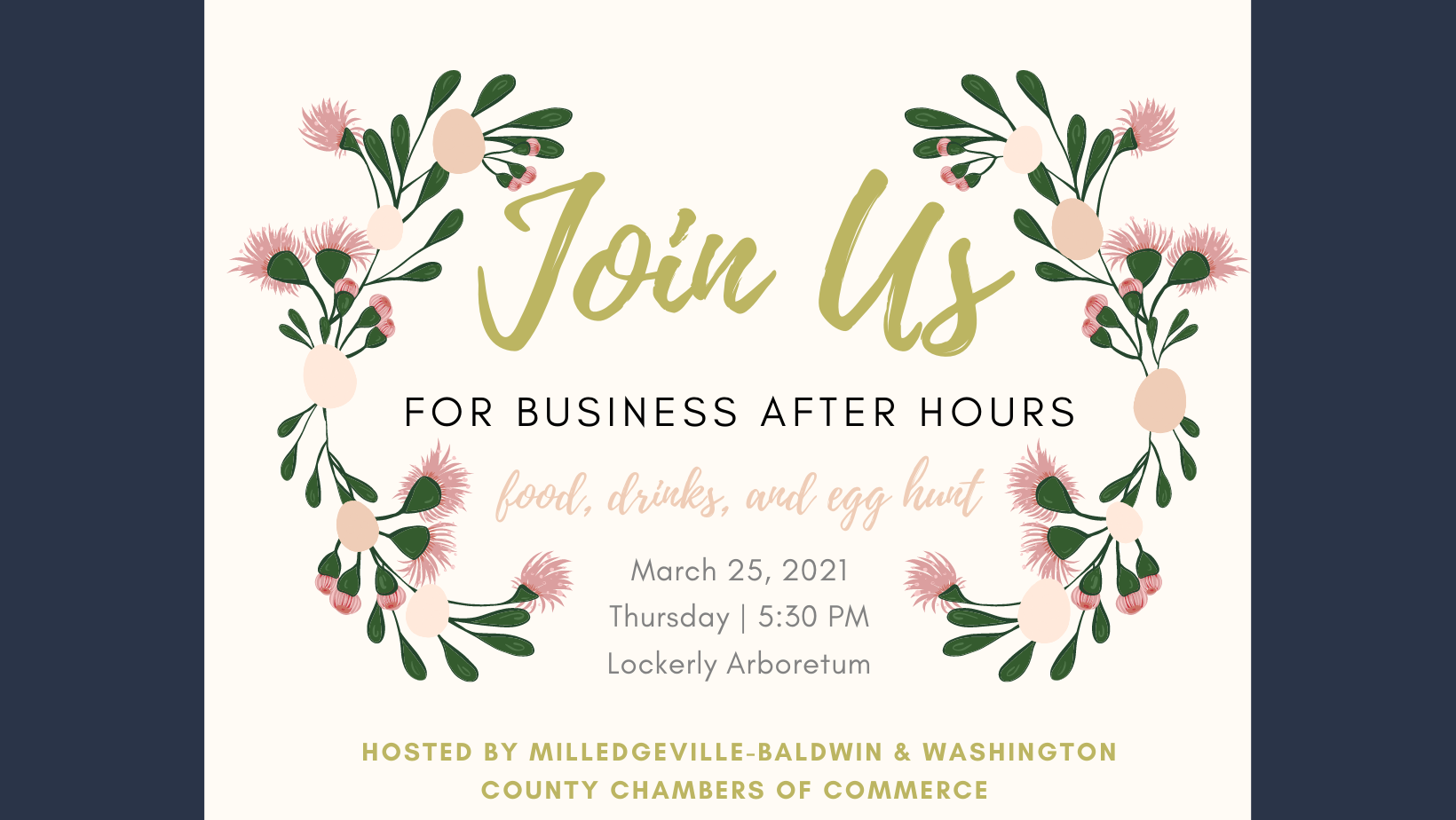 Join the Milledgeville-Baldwin & Washington County Chambers on Thursday, March 25 at Lockerly Arboretum for the Spring Business After Hours. You will be able to enjoy the beautiful grounds of Lockerly, enjoy delicious food and drinks and participate in an egg hunt with exciting prizes for the lucky winners. Click here to register.