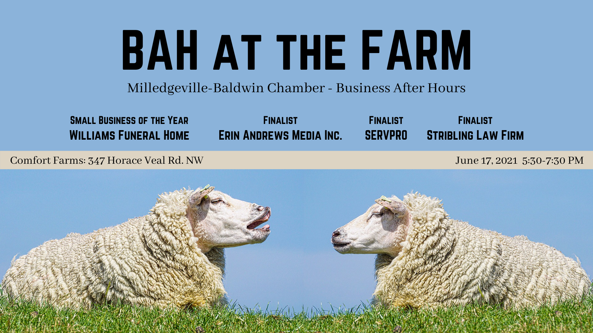 Join us at Comfort Farms on June 17th for our Business After Hours! We will be celebrating and honoring our 2020 Small Business of the Year winner, Williams Funeral Home, and finalists, Erin Andrews Media, ServPro and Stribling Law Firm. There will be amazing and delicious food and drinks, so make sure to register to here today.