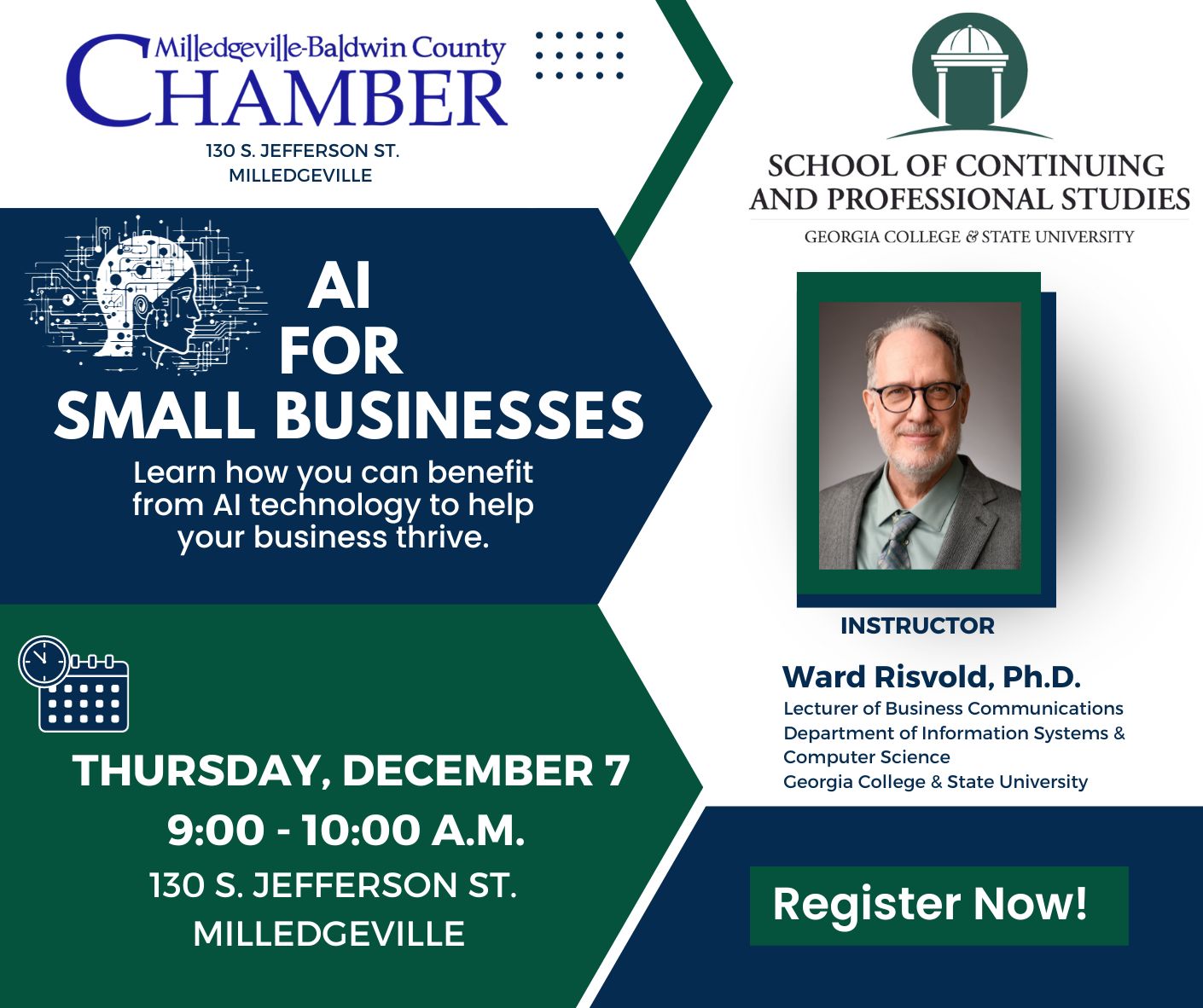 Come and be part of our AI for Small Business Workshop, scheduled for Thursday, December 7th, at 9 am. Ward Risvold, Ph.D., will guide attendees on harnessing the power of AI (artificial intelligence) to boost your business’s success. This work is FREE to attendees. Reserve your spot here today!